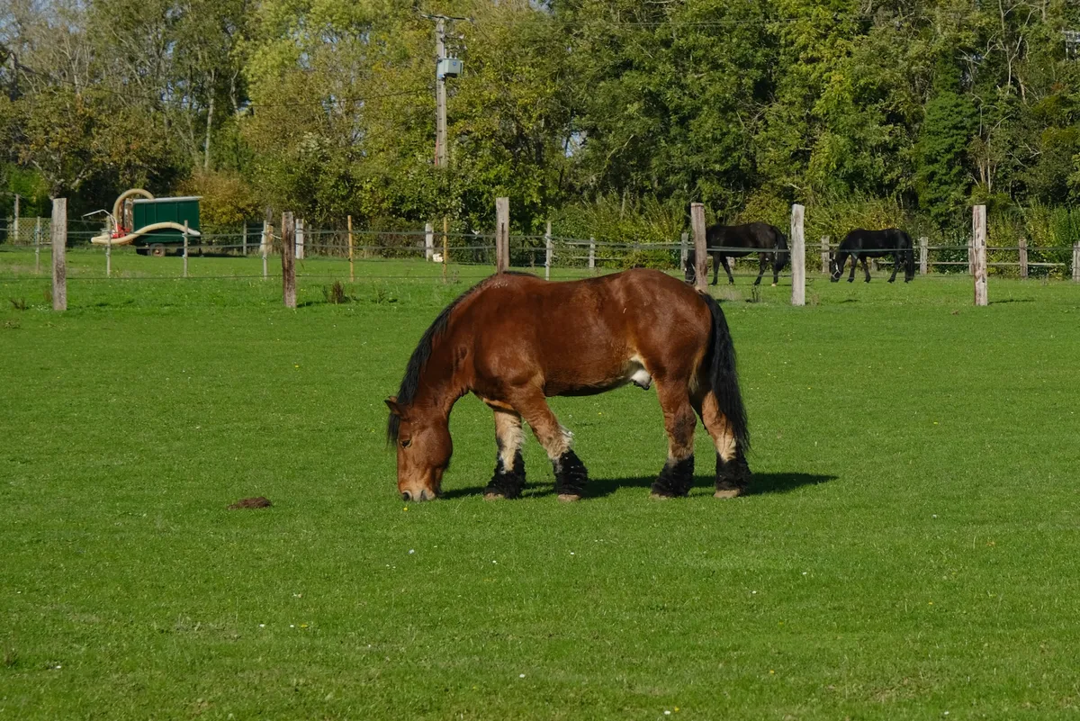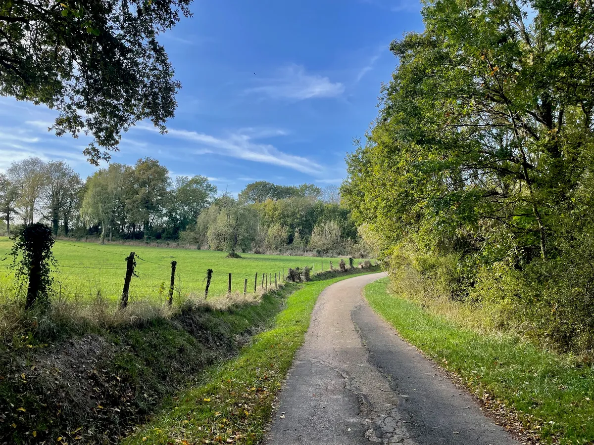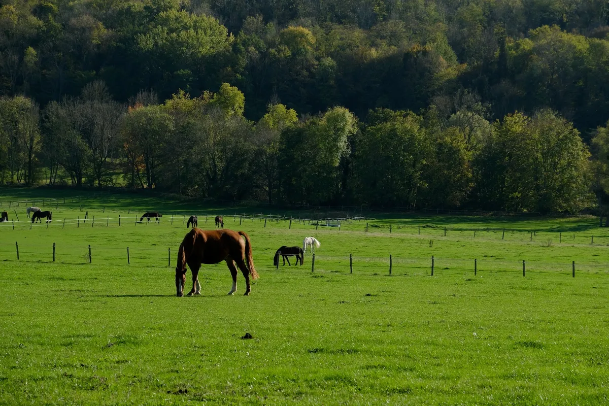 On poursuit entre bois et champs, où paissent tranquillement les chevaux.