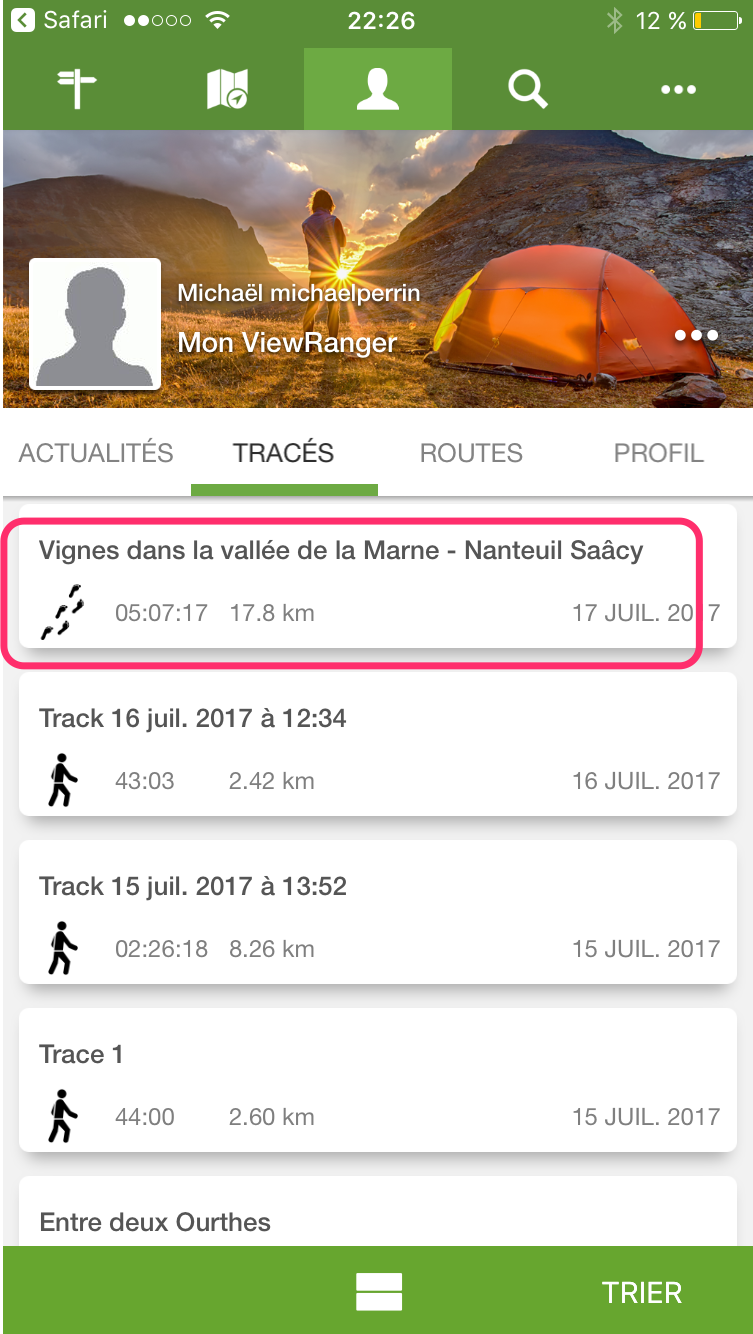 - Rendez-vous dans l'onglet « Profil » de ViewRanger et sélectionnez la randonnée.